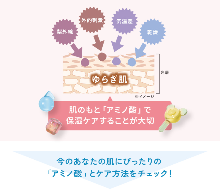厳しい寒さと乾燥により、うるおいがどんどん奪われる冬。そして花粉などの刺激や紫外線ダメージが多くなる春。さまざまな負担がかかるこの時期の肌は、肌本来の”バリア機能”やうるおいを保つ力が低下しやすく不安定な状態に。美肌成分「アミノ酸」を補うことで、根本からうるおいを立て直すことが大切です。