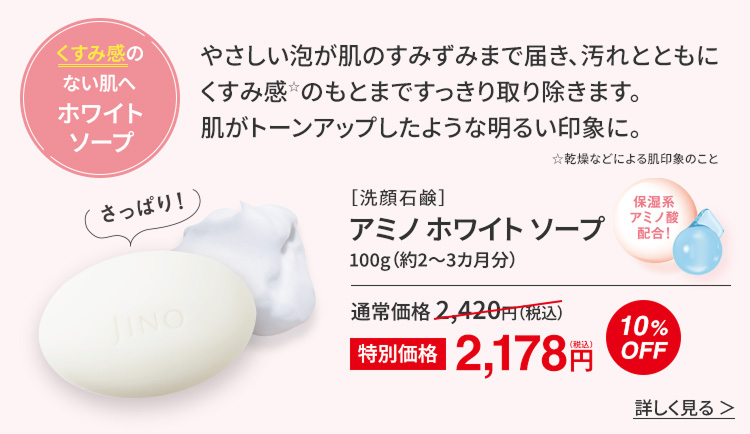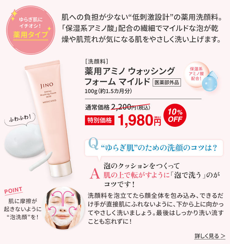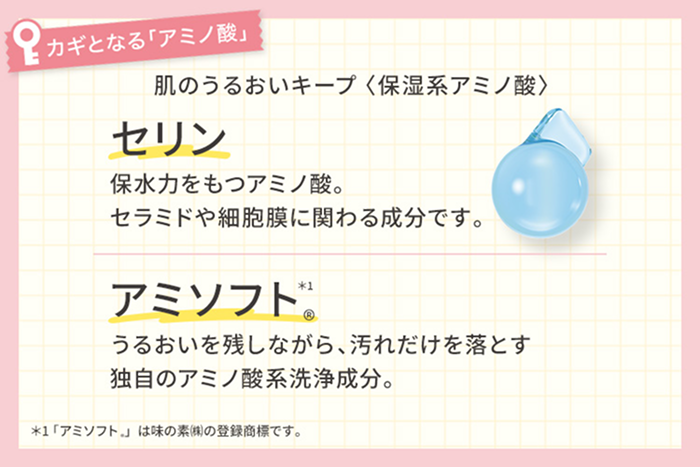 「保湿系アミノ酸」配合の洗顔料なら、きめ細かな泡で肌のうるおいを守りながら汚れだけを洗い落とし、健やかな肌に整えてくれます。